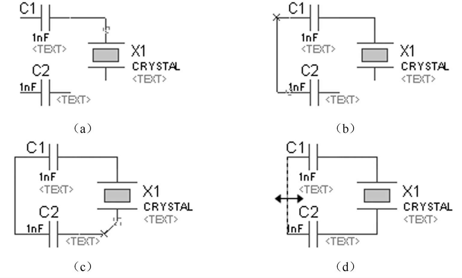 (1)单击鼠标左键选中连线,指针靠近该连线,该线出现双箭头,如图2-19(d)所示。