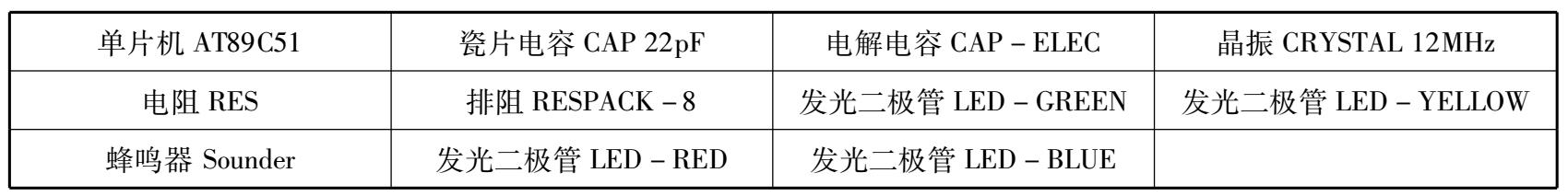 4)为设计项目添加电路元器件 本例中使用的元件见表2-1。