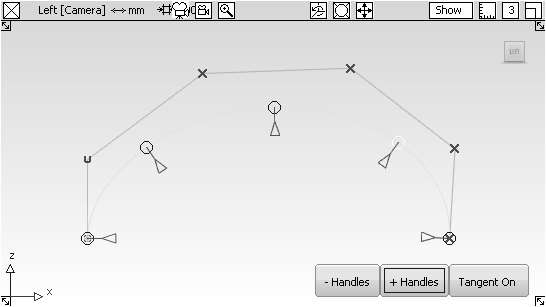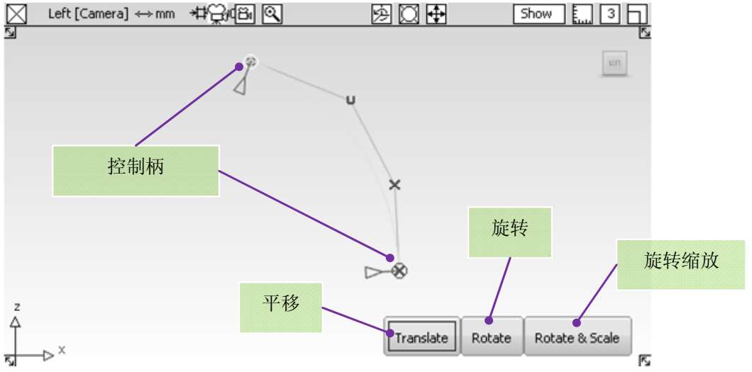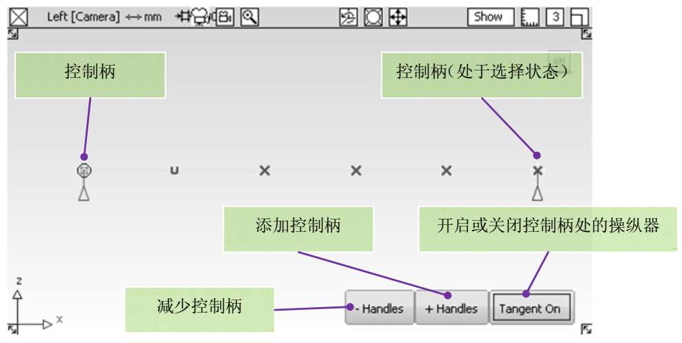 开启控制柄处的操纵器可以调节曲线上该点的位置和切线。