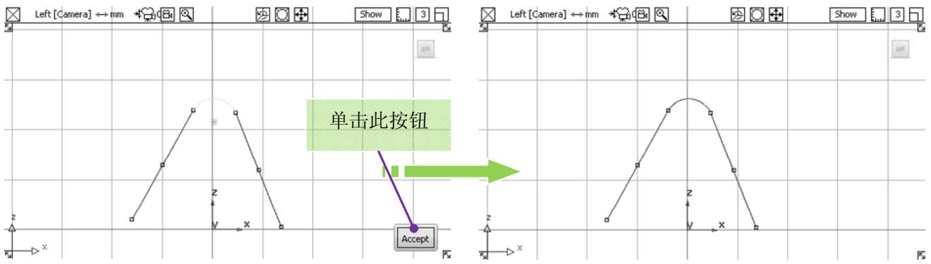 工具,在视图中依次选取两条曲线。在提示行中用键盘输入倒角的半径大小,然后单击视图右下方的【Accept】按钮,创建倒角完成,如图3-23所示。