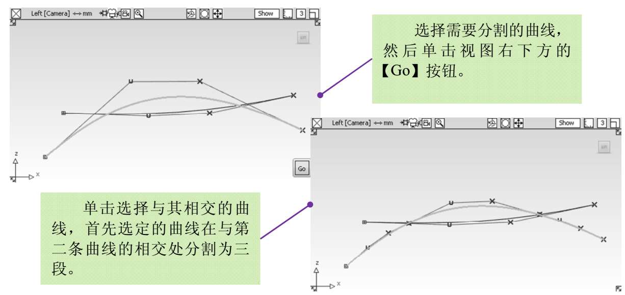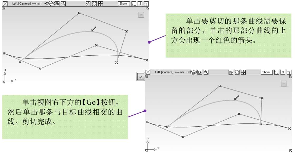 使用默认设置,单击选项框下方的【Go】按钮。在视图中进行一次剪切操作(应先确保视图中有两条相交曲线),如图3-26所示。