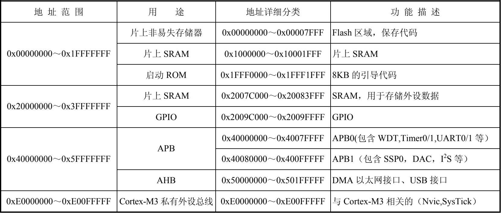 下面来看一下LPC17XX是如何使用Cortex-M3 规定的内存映射的。如表 1-7 所示是LPC17XX的内存映射。LPC17XX在Cortex-M3 的预定义的代码区中有 64KB的SRAM,该部分用于执行代码与保存数据。
