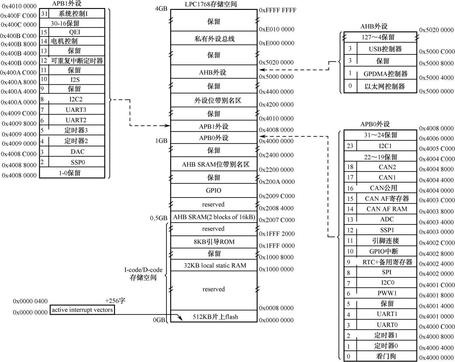 如图 1-5 所示是LPC1768 的存储器映射情况。LPC177X/LPC178X与LPC1768 除了AHB外设(即DMA、USB、以太网及新增加的LCD)的存储空间不一样外,其余的APB占用空间几乎一样。Cortex-M3 的内核空间均符合Cortex-M3 的存储空间分配要求。