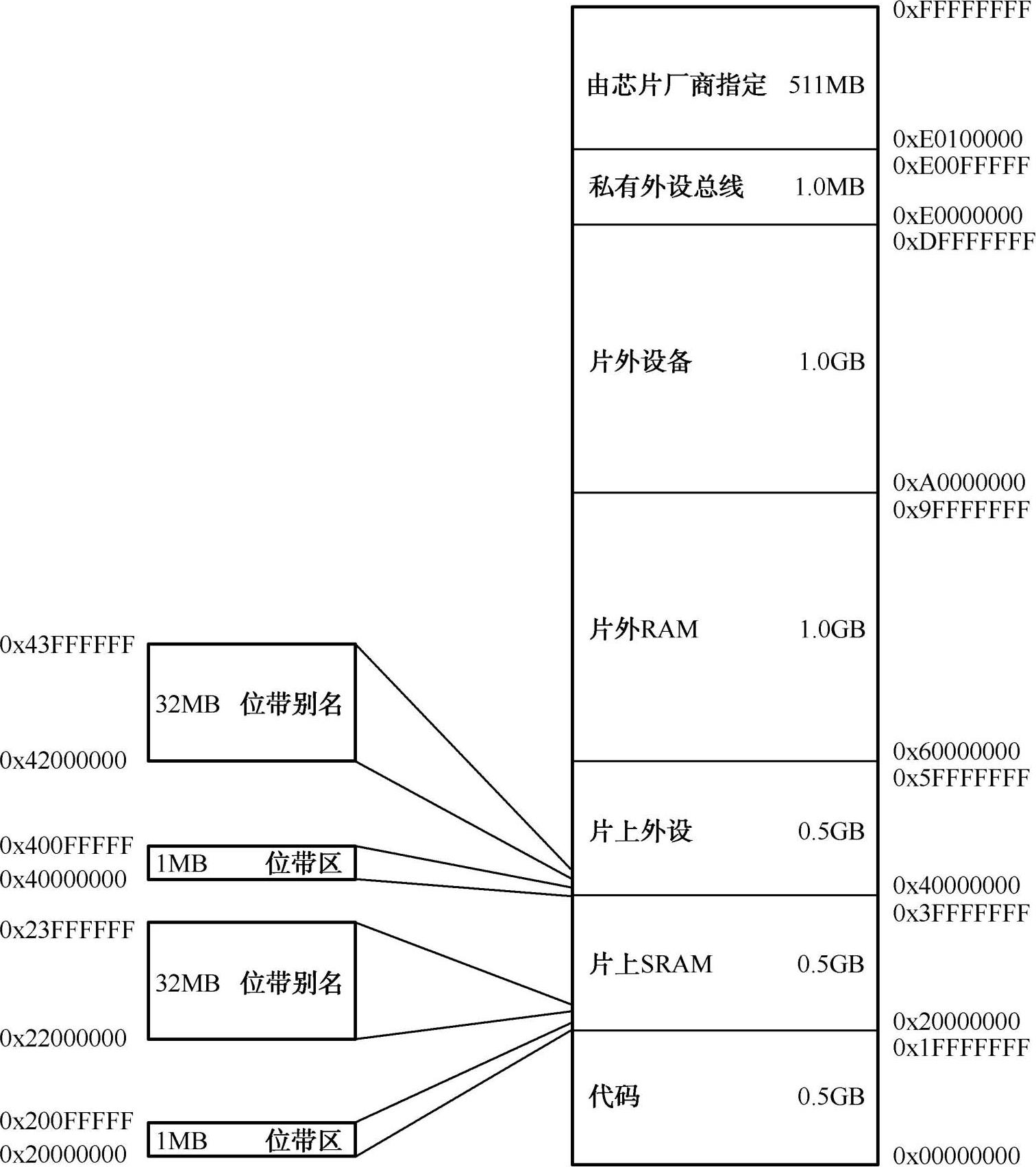 片上SRAM区的大小是 512MB,用于让芯片制造商连接片上的 SRAM,这个区通过系统总线来访问。有一个 1MB 的区间被称为“位带区”。该位带区还有一个对应的 32MB的“位带别名(alias)区”。位带区对应的是最低的 1MB地址范围,而位带别名区里的每个字对应的是位带区的一个比特。位带操作只适用于数据访问,不适用于取指。通过位带的功能,可以把多个布尔型数据打包在单一的字中,但是依然可以从位带别名区中像访问普通内存一样地使用它们。