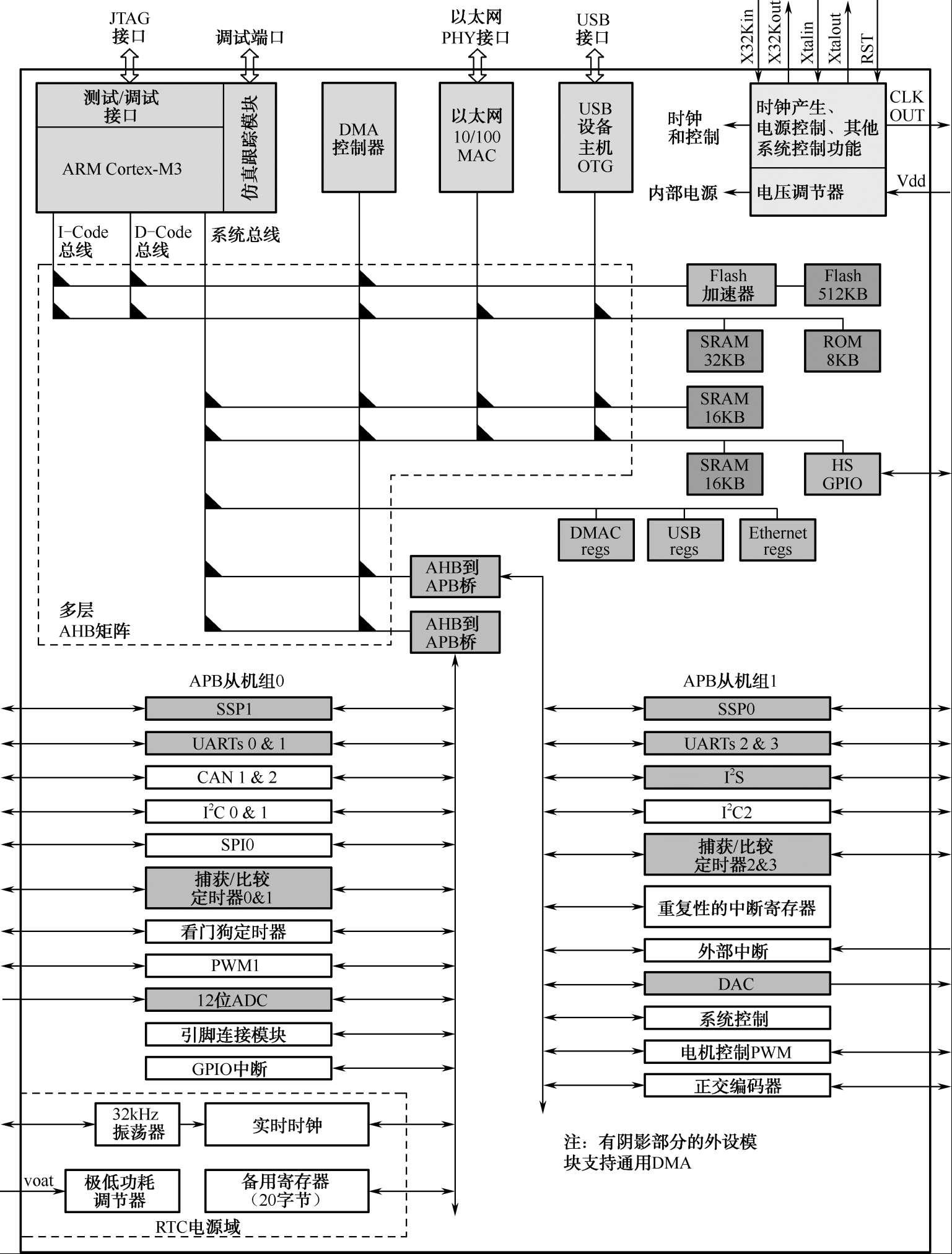 LPC1700 系列Cortex-M3 微控制器使用多层AHB矩阵来连接Cortex-M3 总线,并以灵活的方式将其他总线主机连接到外设,允许多层AHB矩阵上的各外设(使用了不同的从端口)同时被不同的总线主机访问,从而获得最优化的性能。
