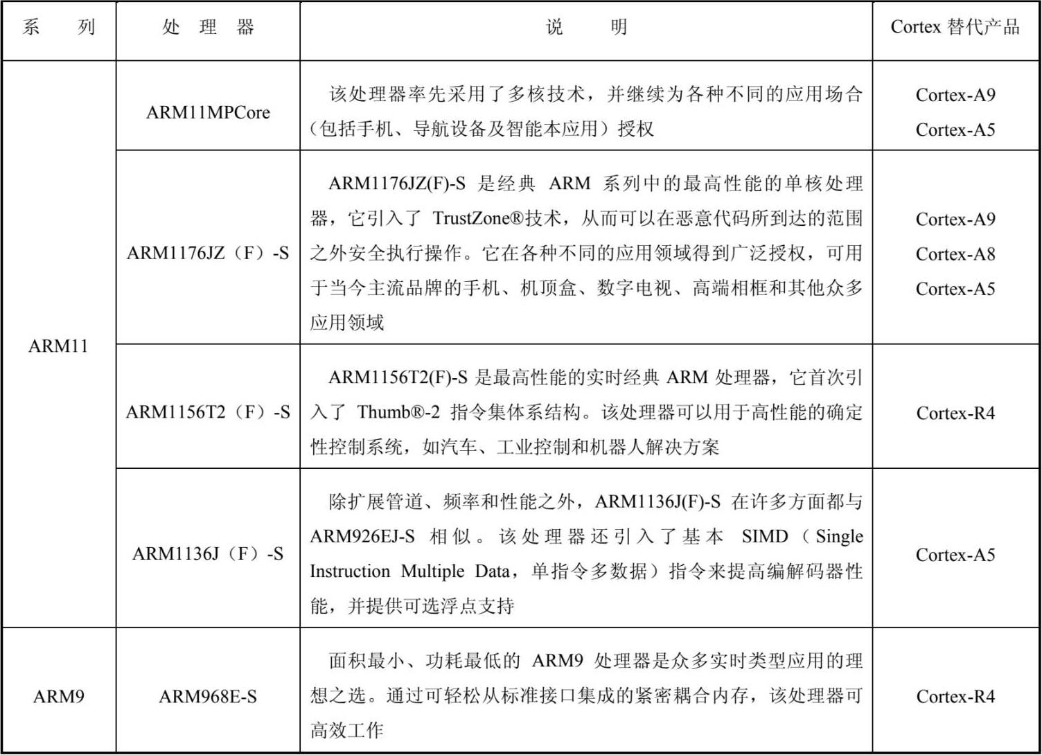 Cortex系列处理器并没有开拓新的应用领域,从某种意义上讲,它是对原有应用领域的主流产品的一次大升级,提供了更好的性能。Cortex系列处理器对应于原有的历史上的各种处理核。ARM公司给出了各种产品的替代关系表,如表 1-2 所示。Cortex系列处理器主要是针对ARM11、ARM9、ARM73 款经典处理器的升级。