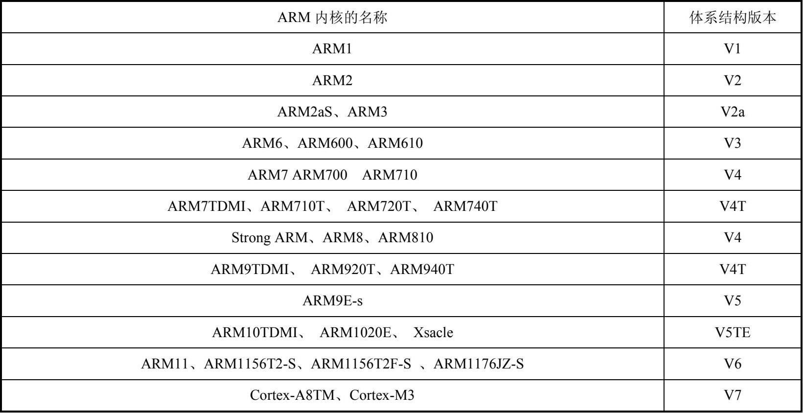 表 1-1 ARM内核与ARM体系结构版本的对应关系
