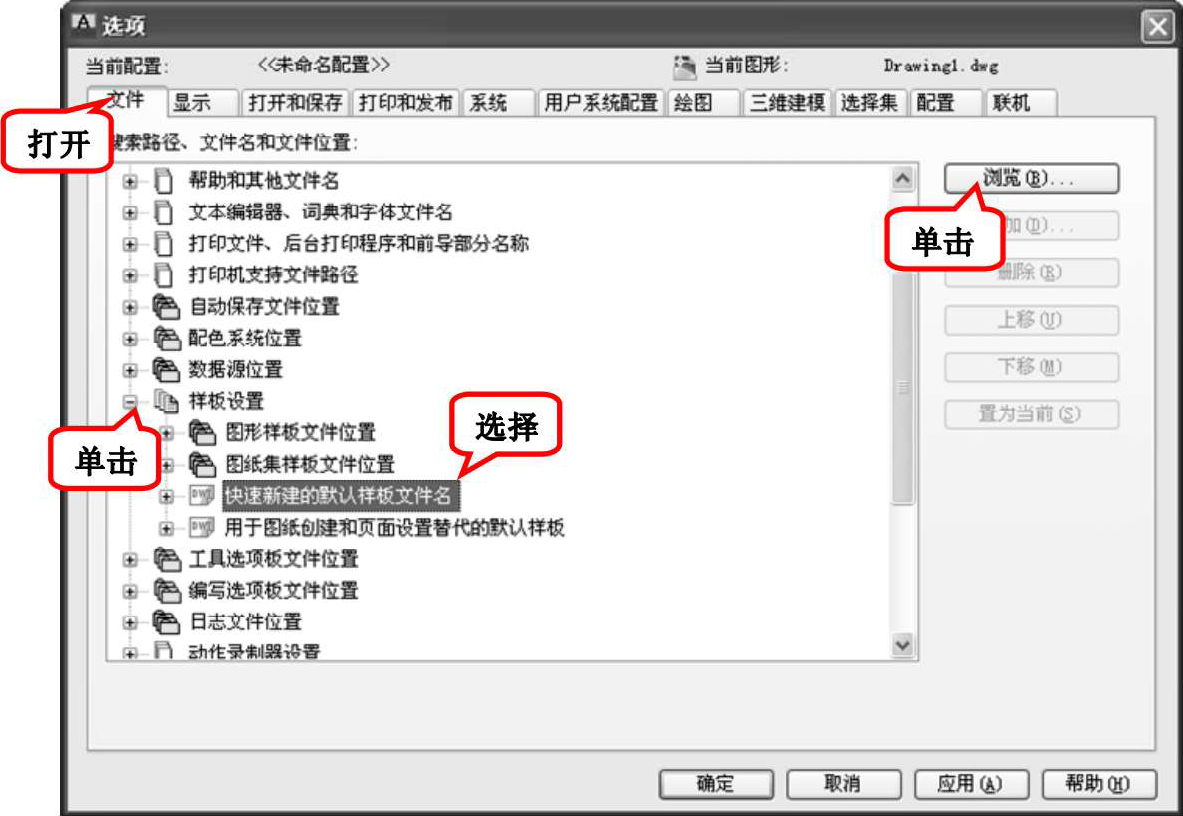 (2)选择菜单栏中的“工具”→“选项”命令,弹出“选项”对话框,打开“文件”选项卡,单击“样板设置”前面的“+”,在展开的选项列表中选择“快速新建的默认样板文件名”选项,如图1-27所示。单击“浏览”按钮,打开“选择文件”对话框,然后选择需要的样板文件即可。
