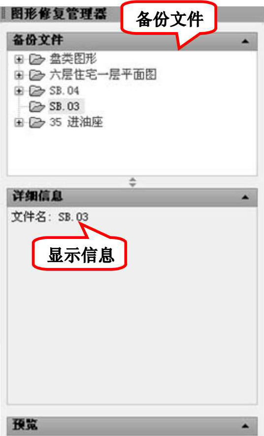 执行上述命令后,系统打开“图形修复管理器”选项板,如图1-31所示,打开“备份文件”列表中的文件,可以重新保存,从而进行修复。