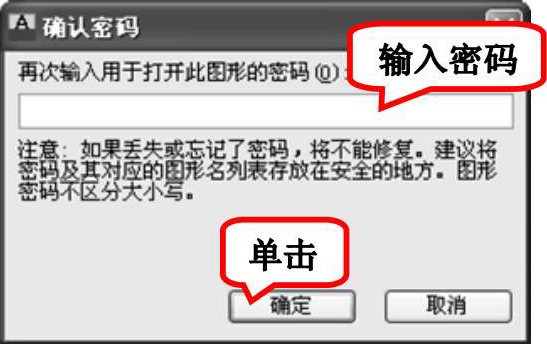 (1)“用于打开此图形的密码或短语”文本框:在文本框中输入密码,用于下次保存图形时添加、更改或删除密码。添加或更改密码时,将显示“确认密码”对话框,如图1-34所示。密码丢失后不能恢复。因此,在添加密码之前,用户应该创建没有密码保护的备份。