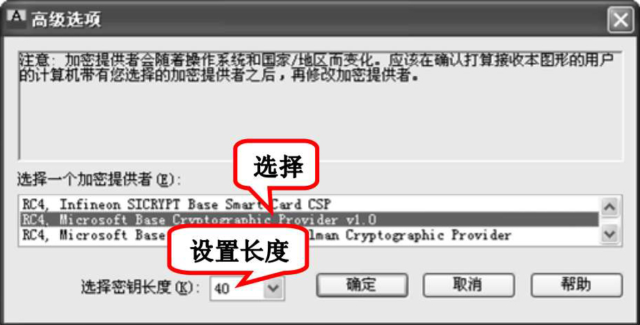 (2)“高级选项”按钮:打开“高级选项”对话框,如图1-35所示。从中可以选择加密提供者和密钥长度。