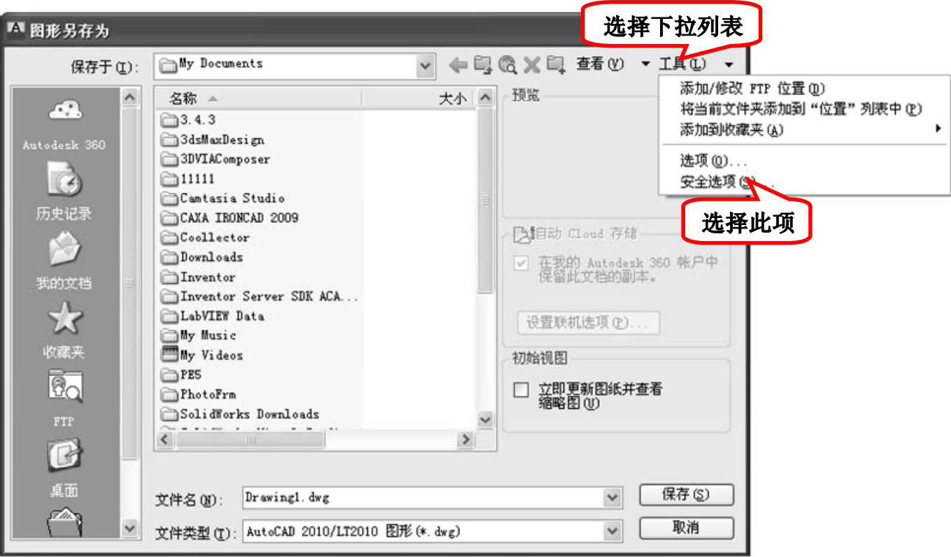 也可在如图1-33所示的“图形另存为”对话框中的“工具”下拉菜单中选择“安全选项”命令。