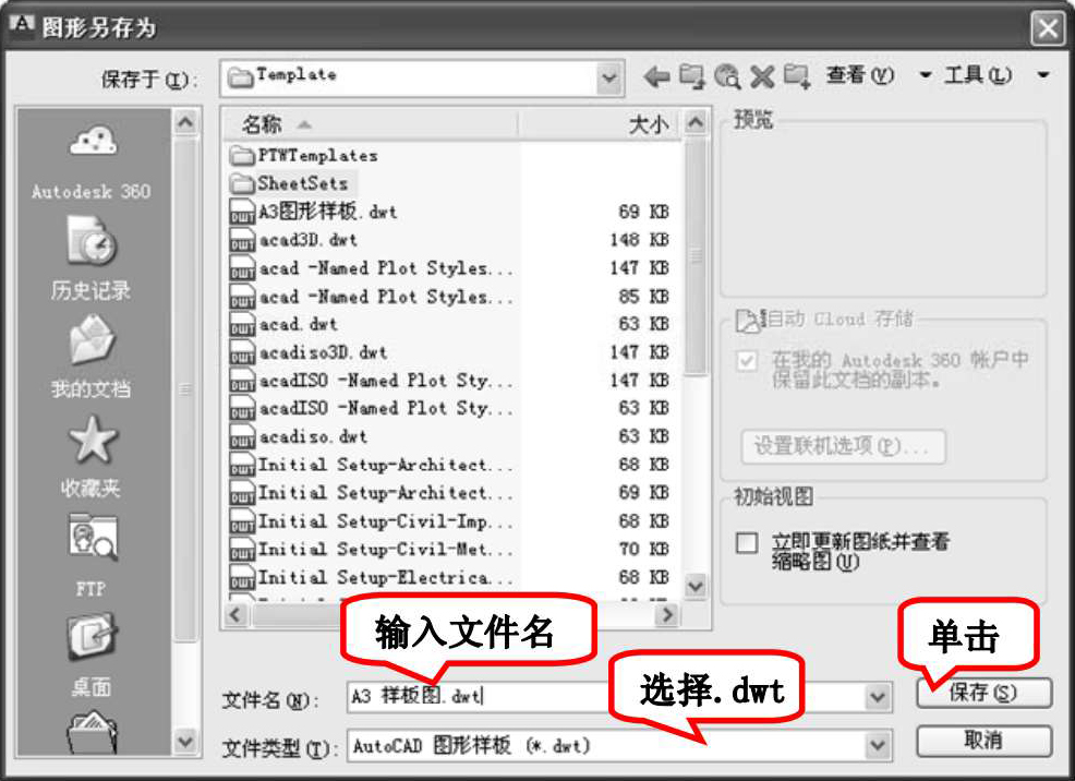 选择菜单栏中的“文件”→“另存为”命令,打开“图形另存为”对话框,如图1-50所示。在“文件类型”下拉列表框中选择“AutoCAD图形样板(*.dwt)”选项,如图1-50所示,输入文件名“A3样板图”,单击“保存”按钮,系统打开“样板选项”对话框,如图1-51所示,接受默认的设置,单击“确定”按钮,保存文件。