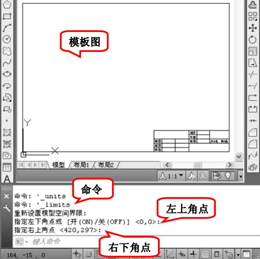选择菜单栏中的“格式”→“图形界限”命令,设置图幅,命令操作如图1-49所示。