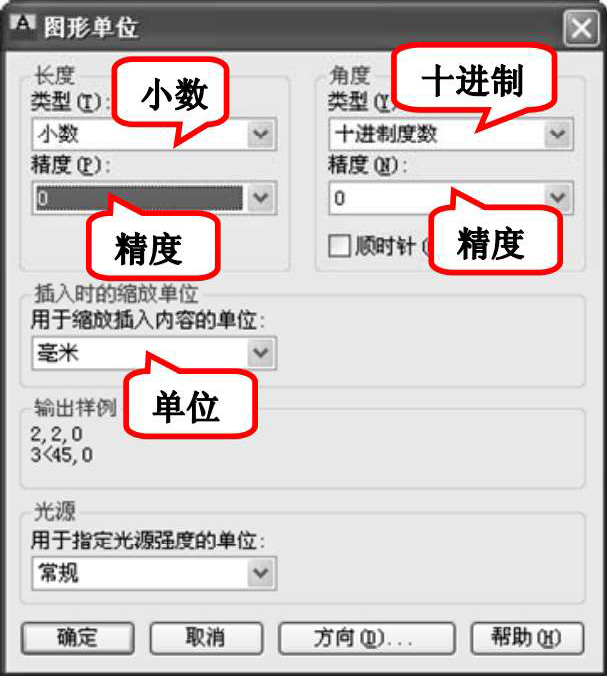 (2)设置单位。选择菜单栏中的“格式”→“单位”命令,AutoCAD打开“图形单位”对话框,如图1-48所示。设置“长度”的“类型”为“小数”,“精度”为0;“角度”的“类型”为“十进制度数”,“精度”为0,系统默认逆时针方向为正,“插入时的缩放单位”设置为“毫米”。