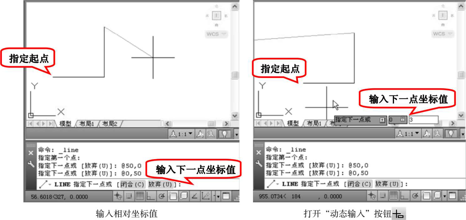 (6)若设置动态数据输入方式(按下状态栏中的“动态输入”按钮 ,如2-1右图所示),则可以动态输入坐标或长度值,效果与非动态数据输入方式类似。除了特别需要,以后不再强调,而只按非动态数据输入方式输入相关数据。
