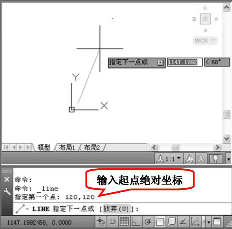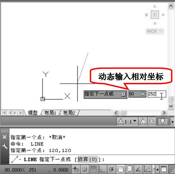 (3)系统继续提示,单击“绘图”工具栏中的“直线”按钮,单击“状态栏”中的“动态输入”按钮,动态输入坐标值,如图2-4所示。