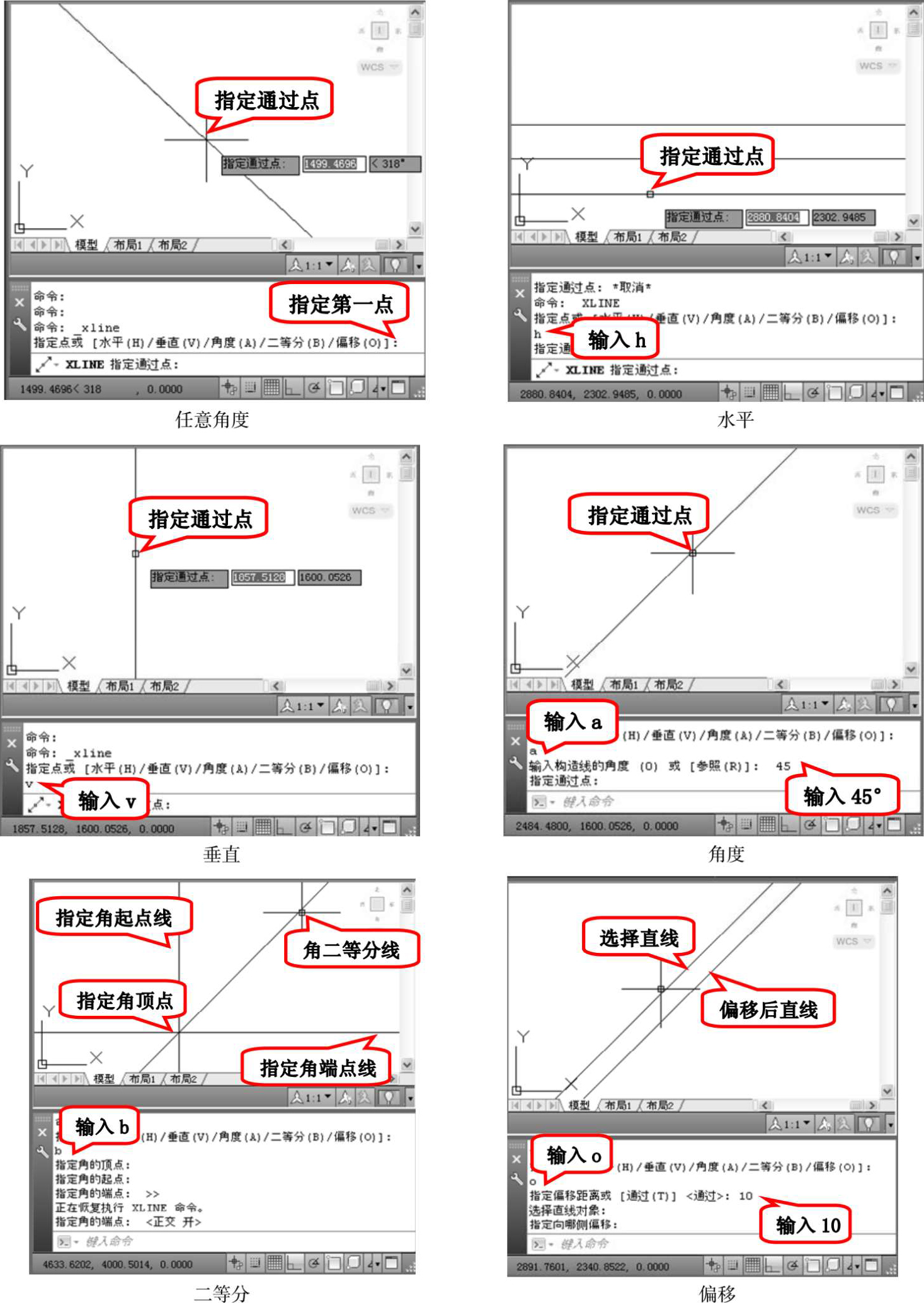 (1)执行选项中有“指定点”、“水平”、“垂直”、“角度”、“二等分”和“偏移”6种方式绘制构造线,分别如图2-6所示。