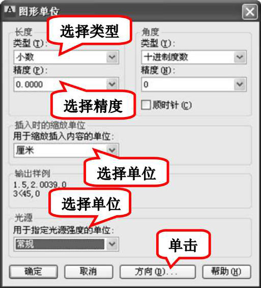 (3)“输出样例”选项组:显示用当前单位和角度设置的例子。