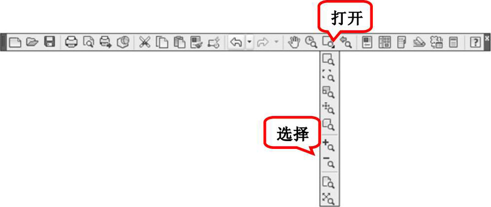 在“标准”工具栏的“缩放”下拉工具栏(如图2-31所示)和“缩放”工具栏(如图2-32所示)中还有一些类似的“缩放”命令,读者可以自行操作体会,这里不再赘述。
