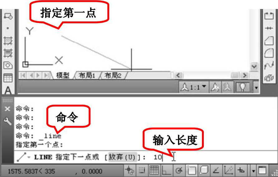 AutoCAD交互绘图必须输入必要的指令和参数。有多种AutoCAD命令输入方式,下面以画直线为例,介绍其命令输入方式。