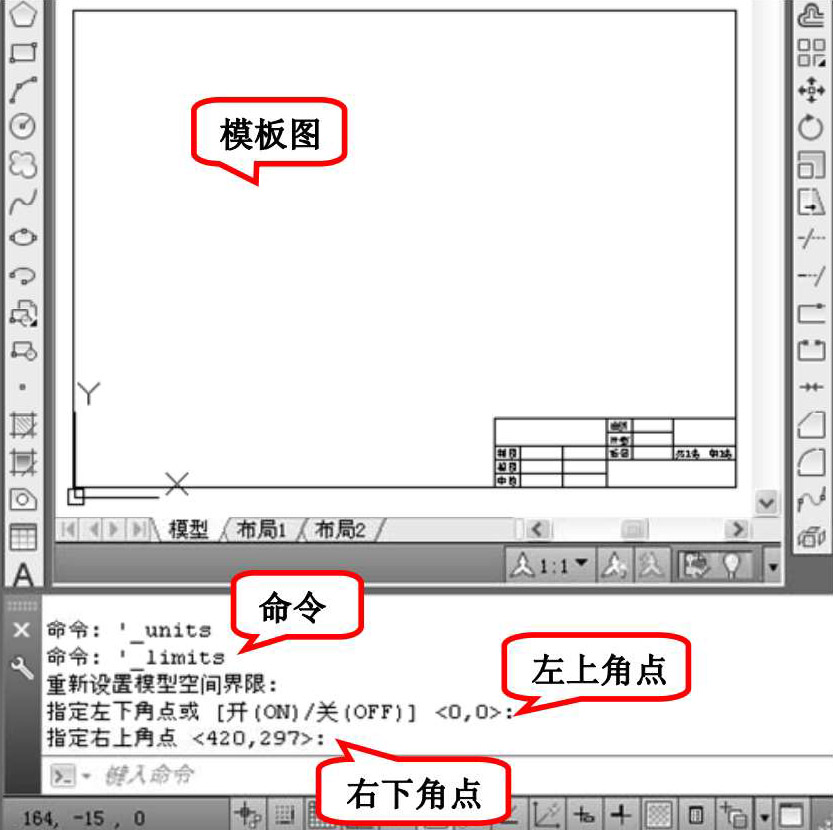 选择菜单栏中的“格式”→“图形界限”命令,设置图幅,命令操作如图2-39所示。