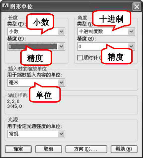 (2)设置单位。选择菜单栏中的“格式”→“单位”命令,AutoCAD打开“图形单位”对话框,如图2-38所示。设置“长度”的类型为“小数”,“精度”为0;“角度”的类型为“十进制度数”,“精度”为0,系统默认逆时针方向为正,“插入时的缩放单位”设置为“毫米”。