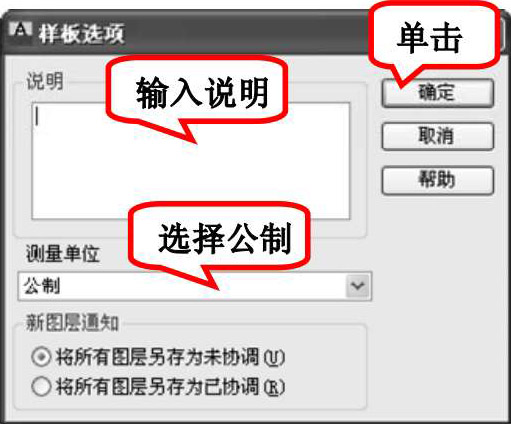 选择菜单栏中的“文件”→“另存为”命令,打开“图形另存为”对话框,如图2-40所示。在“文件类型”下拉列表中选择“AutoCAD图形样板(*.dwt)”选项,输入文件名“A3 样板图.dxt”,单击“保存”按钮,系统打开“样板选项”对话框,接受默认的设置,单击“确定”按钮,保存文件,如图2-41所示。