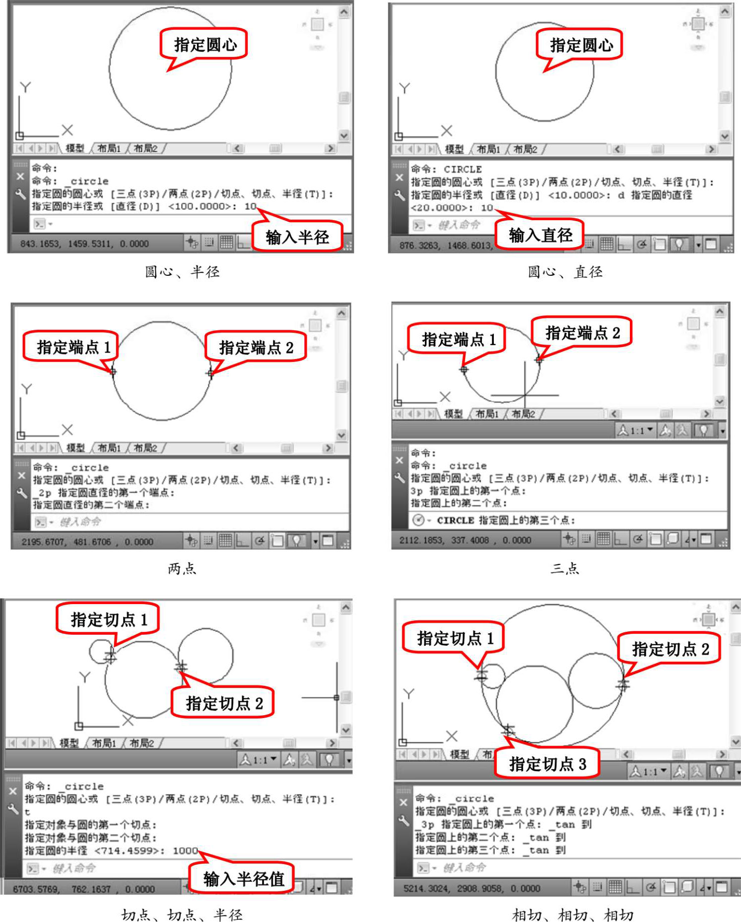 根据给定的不同参数值,绘制圆,在图3-8中显示最简单、最常用的绘制方法。