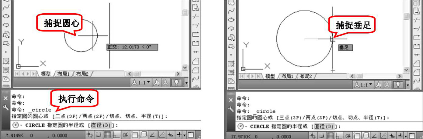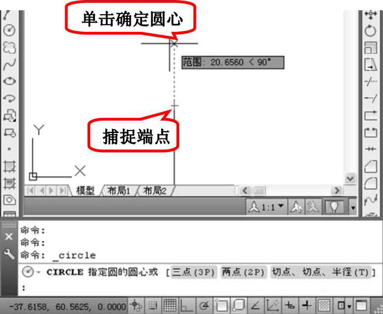 对于圆心点的选择,除了直接输入圆心点外,还可以利用圆心点与中心线的对应关系,利用对象捕捉的方法选择。单击状态栏中的“对象捕捉”按钮 ,命令行中会提示“命令:<对象捕捉 开>”。
