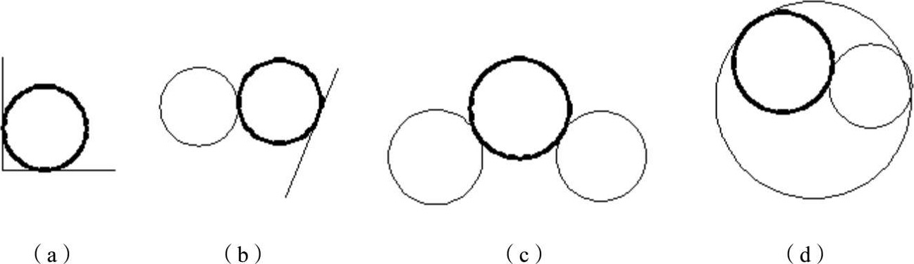 (3)切点、切点、半径(T):通过先指定两个相切对象,再给出半径的方法绘制圆。如图3-9(a)~(d)所示给出了以“切点、切点、半径”方式绘制圆的各种情形(加粗的圆为最后绘制的圆)。