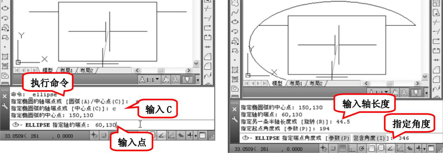 ① 起点角度:指定椭圆弧端点的两种方式之一,光标与椭圆中心点连线的夹角为椭圆端点位置的角度,如图3-23(b)所示。