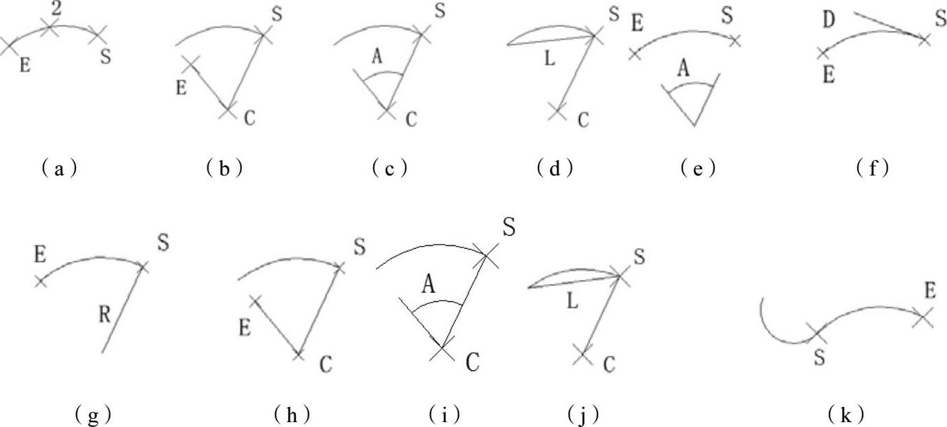 (1)用命令行方式绘制圆弧时,可以根据系统提示选择不同的选项,具体功能和利用菜单栏中的“绘图”→“圆弧”中子菜单提供的11种方式相似。这11种方式绘制的圆弧分别如图3-14(a)~(k)所示。