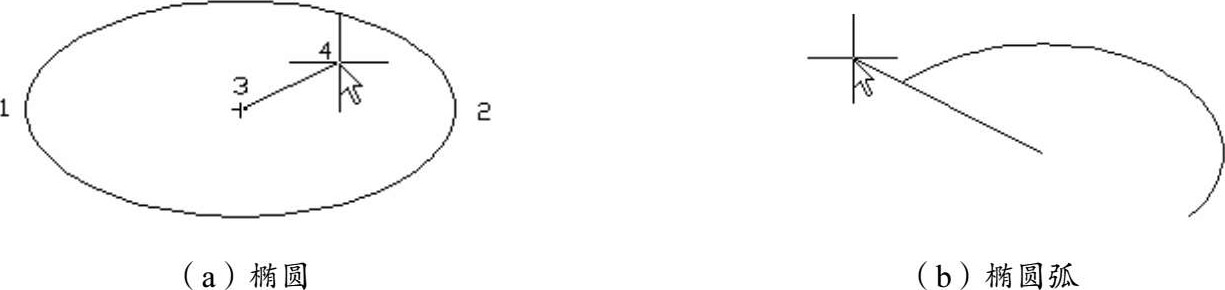 (1)指定椭圆的轴端点:根据两个端点定义椭圆的第一条轴,第一条轴的角度确定了整个椭圆的角度。第一条轴既可定义椭圆的长轴,也可定义其短轴。椭圆按图3-23(a)中显示的1-2-3-4顺序绘制。