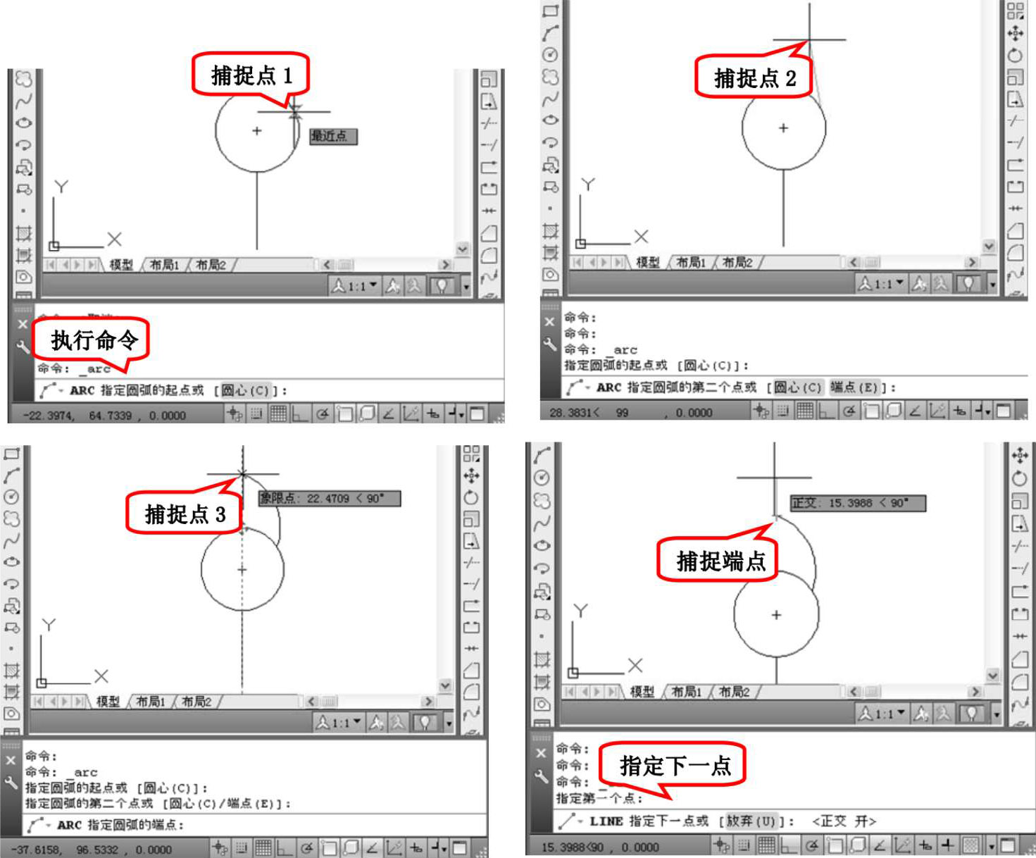 (2)需要强调的是“继续”方式,绘制的圆弧与上一线段圆弧相切。继续绘制圆弧段,只提供端点即可。