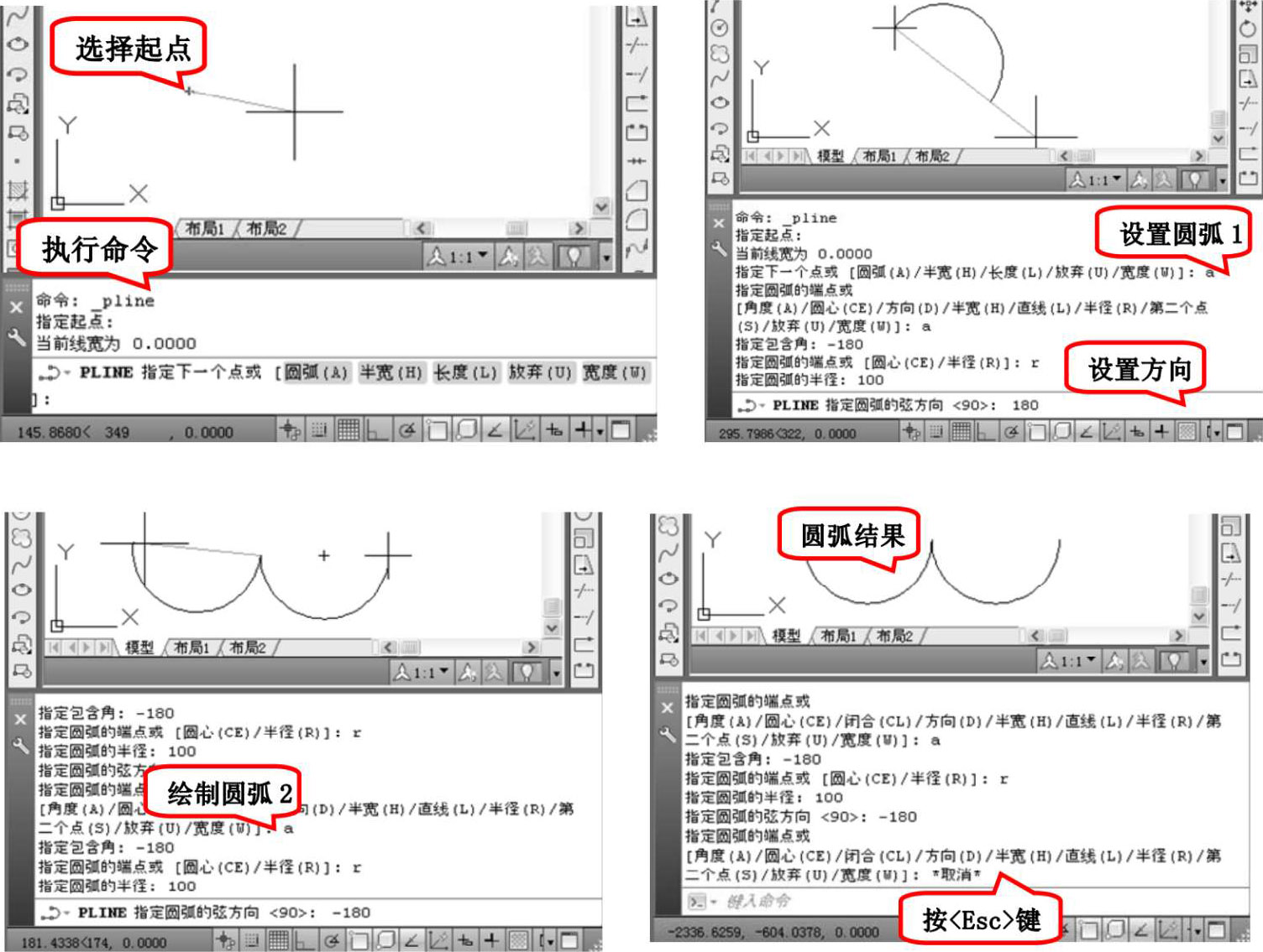 在图3-54中,完成圆弧绘制后,按<Esc>键退出操作,不可输入“U(放弃)”,否则取消圆弧2的绘制。