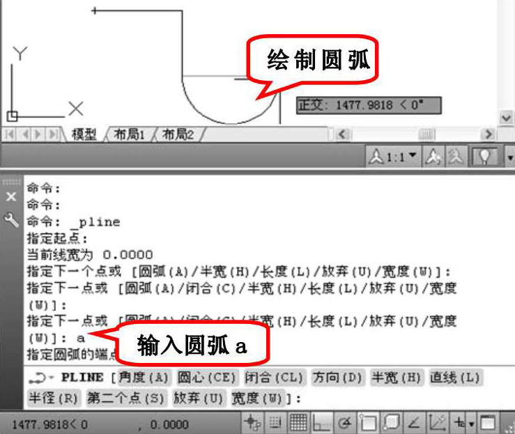 指定下一点或 [圆弧(A)/闭合(C)/半宽(H)/长度(L)/放弃(U)/宽度(W)]: 0,600 (操作出错,但已按回车键,出现下一行命令)