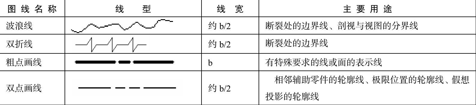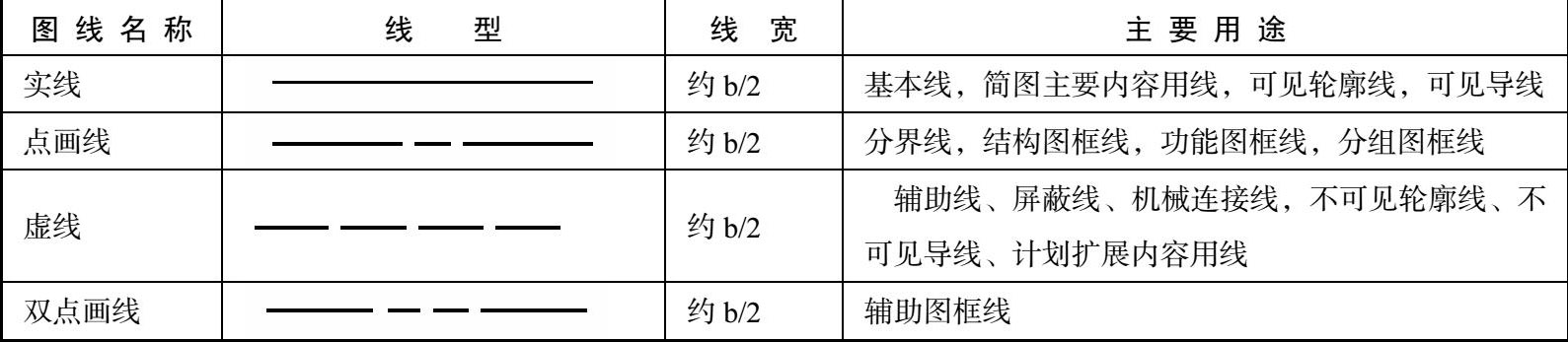 在国家标准GB/T4457.4—1984中,对机械图样中使用的各种图线的名称、线型、线宽及在图样中的应用作了规定,如表4-3所示。其中常用的图线有4种,即粗实线、细实线、虚线、细点画线。图线分为粗、细两种,粗线的宽度b应按图样的大小和图形的复杂程度,在0.5~2mm选择,细线的宽度约为b/2。根据电气图的需要,一般只使用4种图线,如表4-4所示。