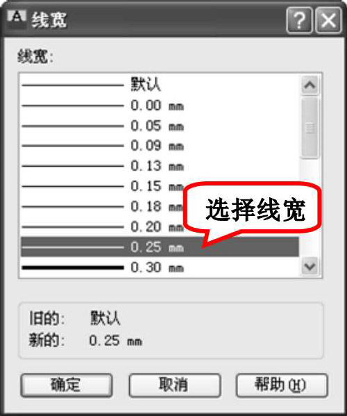 ③ 单击“实线”层对应的“线宽”按钮,打开“线宽”对话框,选择0.25 mm线宽,如图4-33所示,确认后退出。