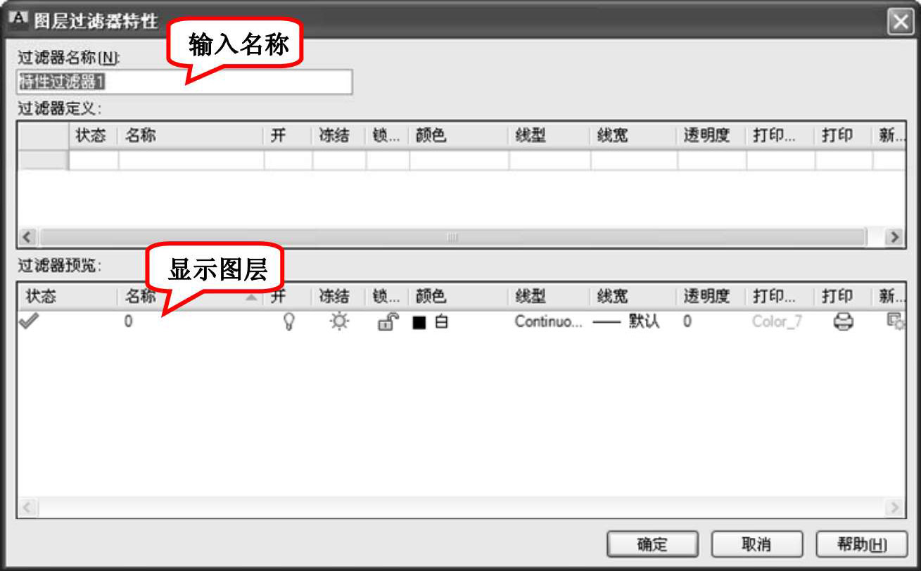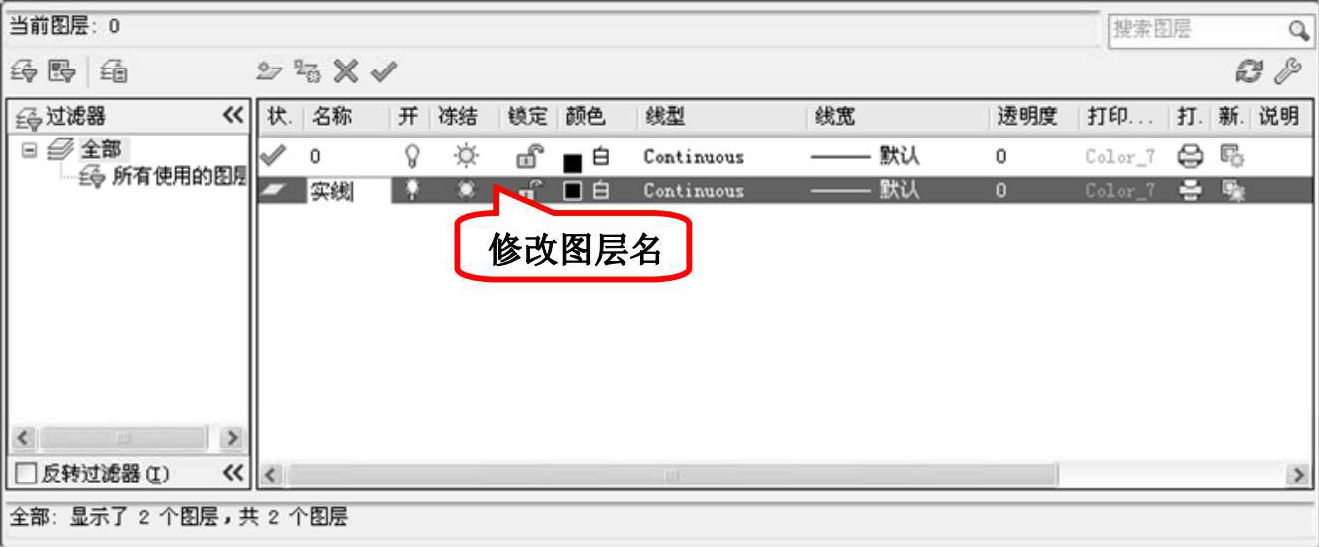 (8)“搜索图层”文本框:输入字符时,按名称快速过滤图层列表。关闭图层特性管理器时并不保存此过滤结果。