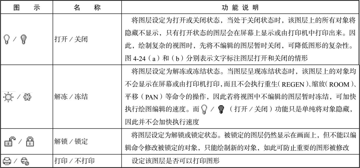 ③ 状态转换图标:在“图层特性管理器”窗口的名称栏分别有一列图标,移动指针到图标上并单击可以打开或关闭该图标所代表的功能,或从详细数据区中勾选或取消勾选关闭(