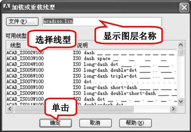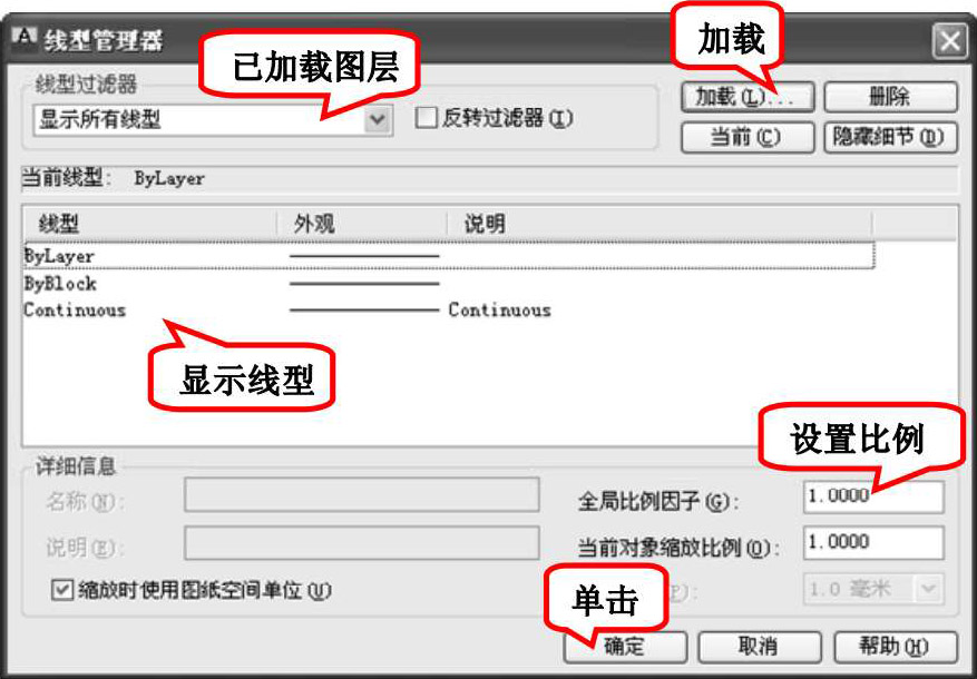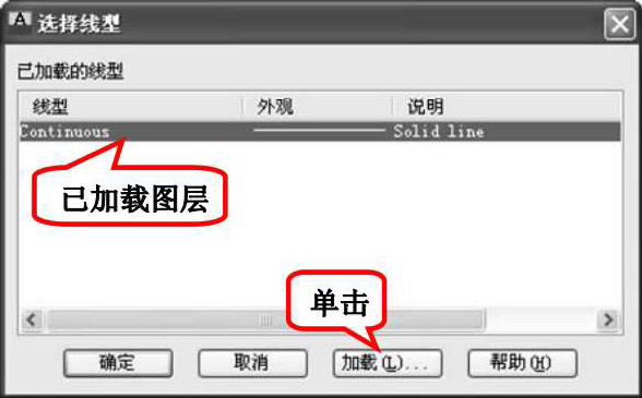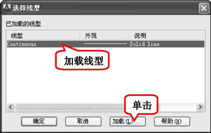 (1)“已加载的线型”列表框:显示在当前绘图中加载的线型,可供用户选用,其右侧显示出线型的形式。