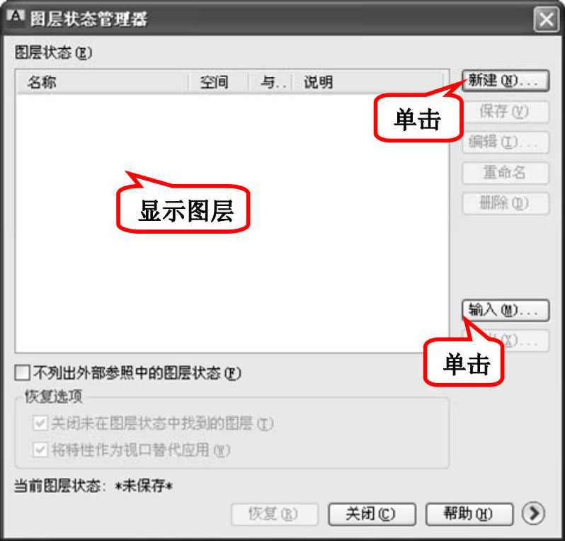 :单击该按钮,可以打开“图层状态管理器”对话框,如图4-23所示。从中可以将图层的当前特性设置保存到命名图层状态中,以后可以再恢复这些设置。