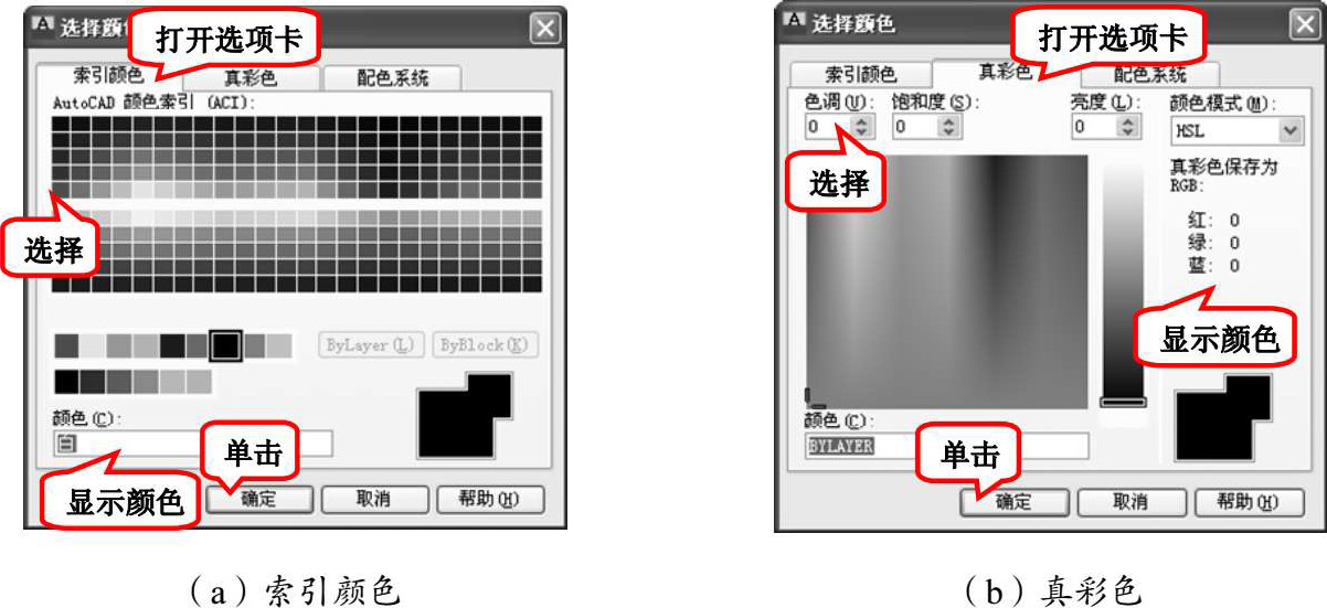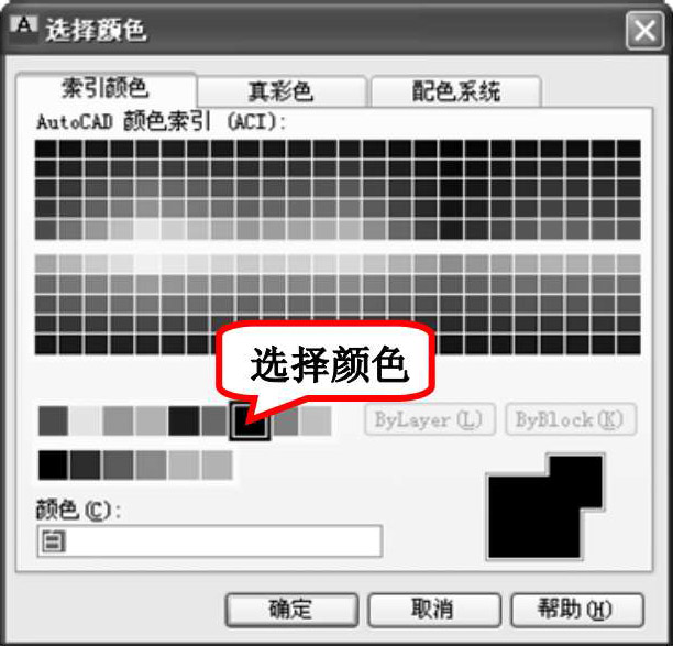 (1)“颜色控制”下拉列表:单击右侧的向下箭头,弹出一下拉列表,用户可从中选择使之成为当前颜色,如果选择“选择颜色”选项,则AutoCAD打开“选择颜色”对话框以选择其他颜色。修改当前颜色之后,不论在哪个图层上绘图都采用这种颜色,但对各个图层的颜色设置没有影响。