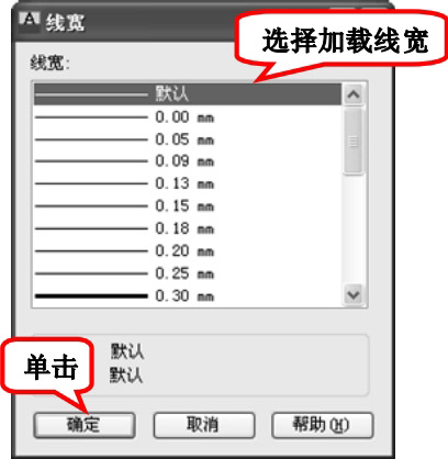 (3)“线宽”下拉列表:单击右侧的向下箭头,弹出一下拉列表,用户可从中选择一个线宽使之成为当前线宽。修改当前线宽之后,不论在哪个图层上绘图都采用这种线宽,但对各个图层的线宽设置没有影响。
