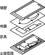 图层的概念类似投影片,将不同属性的对象分别放置在不同的投影片(图层)上。例如将图形的主要线段、中心线、尺寸标注等分别绘制在不同的图层上,每个图层可设定不同的线型、线条颜色,然后把不同的图层堆栈在一起成为一张完整的视图,这样可使视图层次分明,方便图形对象的编辑与管理。一个完整的图形就是由它所包含的所有图层上的对象叠加在一起构成的,如图4-20所示。