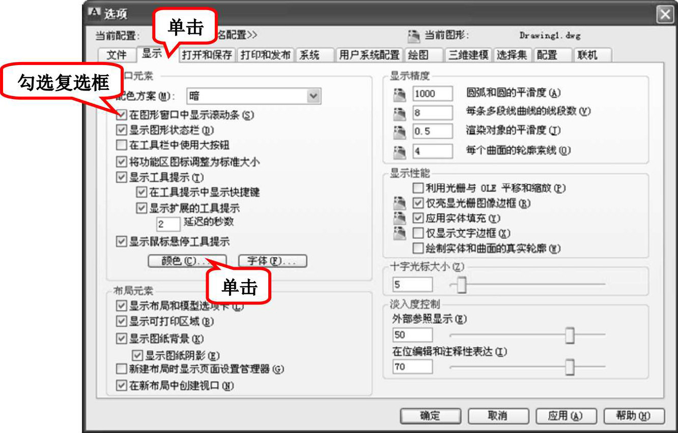 (1)选择菜单栏中的“工具”→“选项”命令,打开“选项”对话框,单击如图2-20所示的“显示”选项卡,再单击“窗口元素”选项组中的“颜色”按钮,打开如图2-21所示的“图形窗口颜色”对话框。