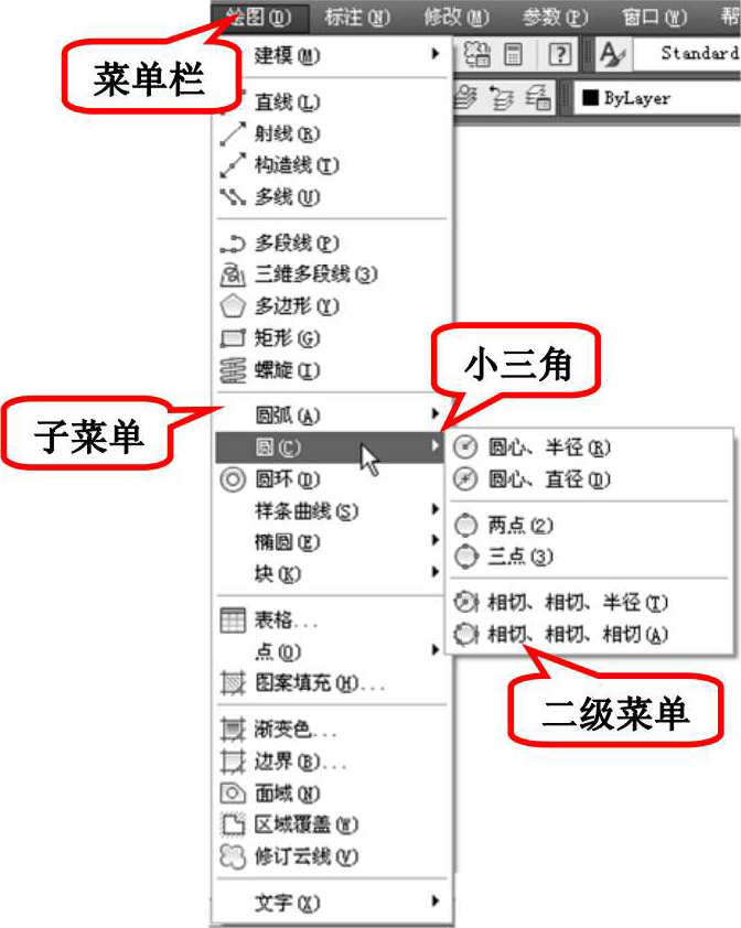 (1)带有子菜单的菜单命令。这种类型的菜单命令后面带有小三角形。例如,选择菜单栏中的“绘图”命令,指向其下拉菜单中的“圆”命令,系统就会进一步显示出“圆”子菜单中所包含的命令,如图2-2所示。