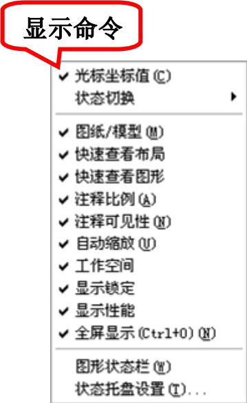 状态托盘包括一些常见的显示工具和注释工具按钮,包括模型与布局空间转换按钮,如图2-12所示,通过这些按钮可以控制图形或绘图区的状态。