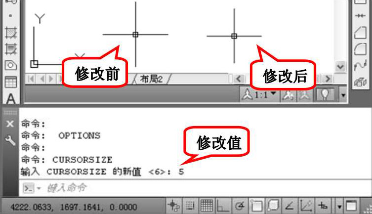 此外,还可以通过设置系统变量CURSORSIZE的值,修改其大小,结果如图2-17所示。